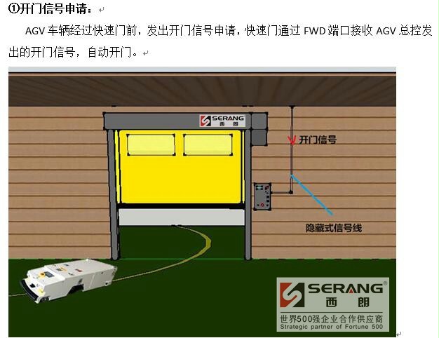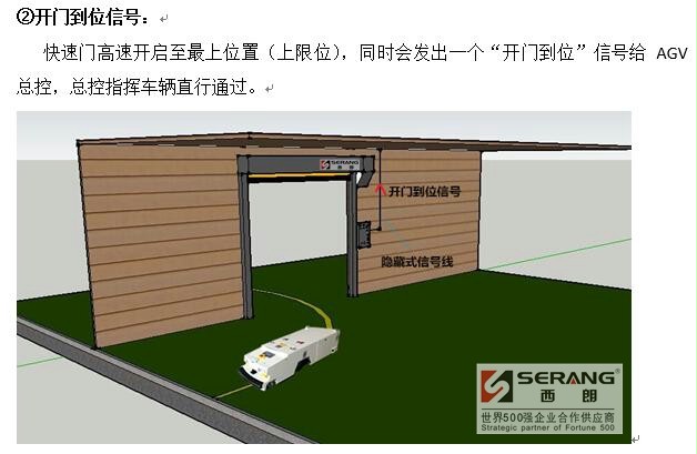 下图为:AGV搬运车到达快速门附近时,传递信号给快速门,快速门接到信号指令快速开启,AGV搬运车顺利通过