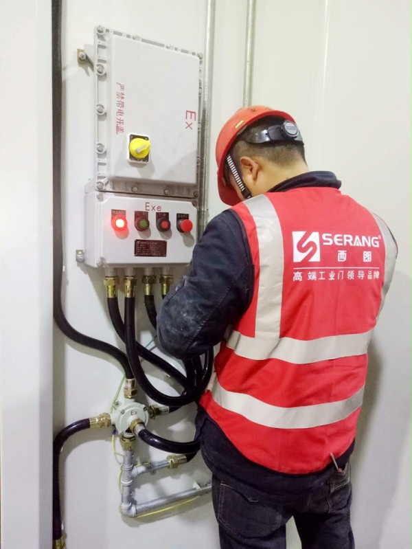 下图为:蘑菇视频免费网站门业工业门研究院的技术工程师在进行快速门的布线调试工作