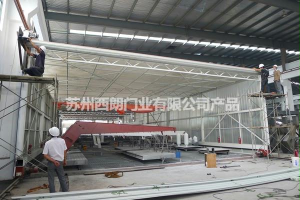 该大型钢制卷帘门,跨度达到12米的宽度,高度为5米,安装在喷涂活动房的框架上,安装完毕后,大型卷帘门采用手动按钮和遥控双重控制开关门,与活动房一起移动配合使用,满足喷涂设备作业时隔离外部的需求,并起到防护的作用。
